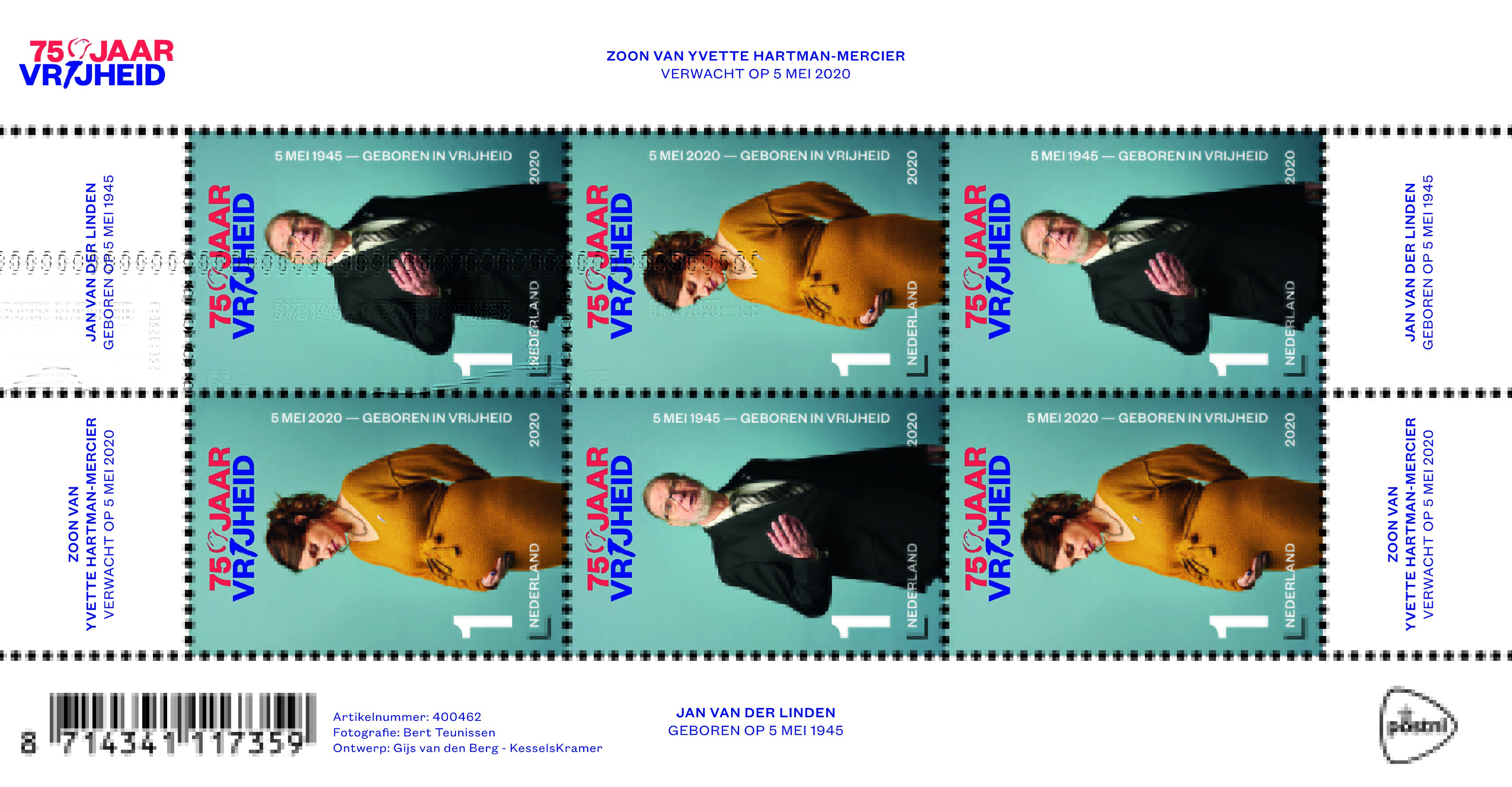 Uitgerekend op 5 mei 2020 De portrettencampagne was al bedacht, maar nog niet uitgevoerd toen PostNL aan Van den Berg vroeg ook de postzegels 75 jaar vrijheid te ontwerpen. “Het ging om 6 postzegels in 2 ontwerpen. Al snel kwam het idee naar boven om in die 2 ontwerpen zowel de eerste als de laatste persoon te laten zien die in vrijheid was geboren. Ons lijstje telde 75 personen. Daar is toen een 76e aan toegevoegd, een kind dat op 5 mei 2020 zou worden geboren. Dat leek heel moeilijk, maar verrassend genoeg bleken ze zelfs letterlijk binnen handbereik te zijn. Zo is een collega van mij bij KesselsKramer op 5 mei 2020 uitgerekend. En dat gold ook, het toeval wordt nog groter, voor Yvette Hartman-Mercier, die voor het Nationaal Comité 4 en 5 mei werkt. Zij staat daarom zwanger en al op de postzegel.”
