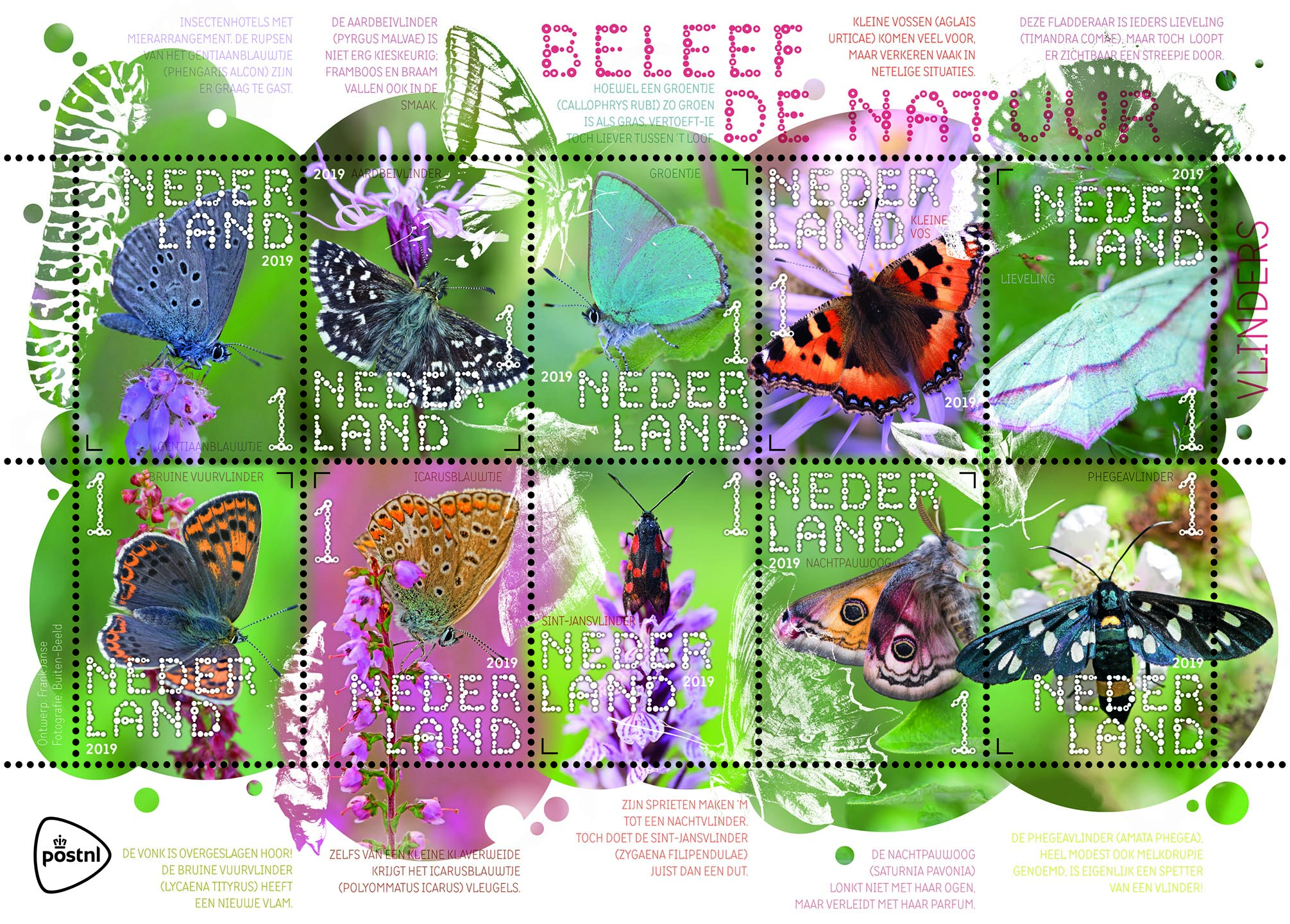 Op 11 juni 2019 geeft PostNL Beleef de natuur – vlinders uit, een vel met tien postzegels in tien verschillende ontwerpen. Op de postzegels staat de waardeaanduiding 1 voor post tot en met 20 gram met een bestemming binnen Nederland. De uitgifte is de zevende in de serie Beleef de natuur en de derde van 2019. Ook dit jaar geeft PostNL in deze serie vier vellen uit met in totaal veertig postzegels, ingedeeld per seizoen.