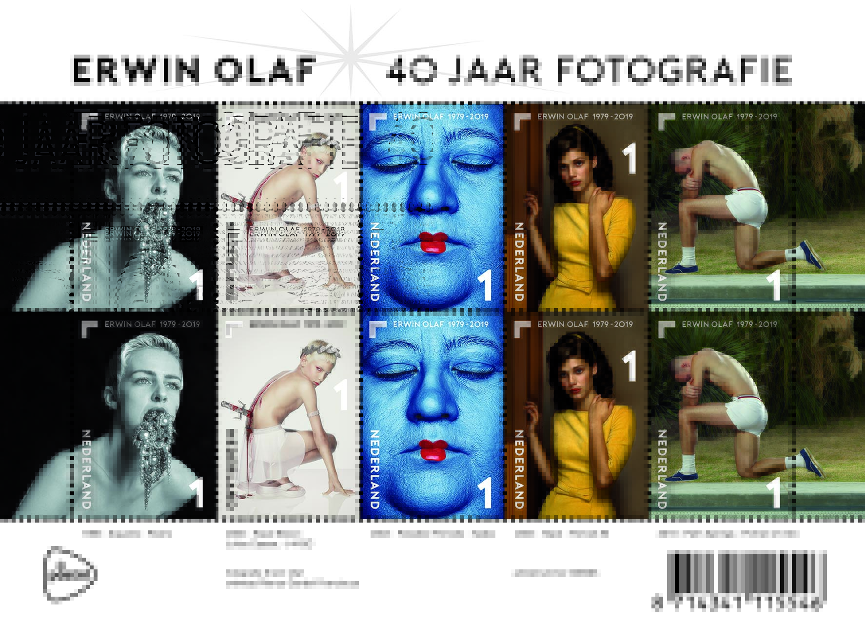 Op het postzegelvel Erwin Olaf 40 jaar fotografie staan vijf foto’s van zijn hand. De vijf van links naar rechts zijn Pearls (uit de serie Squares, 1986), Julius Caesar, † 44 BC (uit de serie Royal Blood, 2000), Nadia (uit de serie Paradise Portraits, 2002), Portrait #5 (uit de serie Hope, 2005) en Portrait of Alex (uit de serie Palm Springs, 2018). Alle foto’s zijn onmiskenbaar Erwin Olaf, die een ‘perfecte wereld wil laten zien met een barst erin’. De foto’s lopen door op de tabs links en rechts. Op de onderste velrand staan de namen van de afgebeelde foto’s en de serie waaruit ze komen, op de bovenste velrand is de titel van de uitgifte te lezen. Op sommige onderdelen van het vel is met zeefdruk UV-lak (spotvernis) aangebracht.