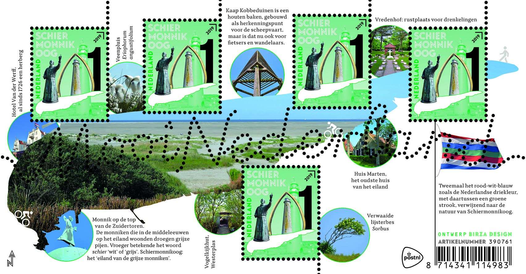 Het postzegelvel Mooi Nederland 2019: Schiermonnikoog besteedt vooral aandacht aan de natuur en de architectuur van het eiland. “Bij onze selectie van foto’s hebben we associatief gezocht naar afbeeldingen met een verháál”, aldus Ingmar Birza. “De meeste verhalen hebben we in een bijschrift opgenomen, soms in een paar woorden. De verhalen passen bij het concept dat we voor deze postzegels hebben bedacht tijdens ons werkbezoek aan de Waddeneilanden. Daarin staat de vorm van het eiland centraal, vandaar de kaart van Schiermonnikoog die zowel op de postzegels als op de velrand staat. Op de postzegel is de eilandvorm als los plakje Nederland gekoppeld aan de forse waardeaanduiding 1. Die 1 hebben we even groot gemaakt als de vuurtoren ernaast. De vuurtorenfoto is in duotone omgezet om te voorkomen dat de andere foto’s worden weggedrukt. Daardoor zijn de walviskaak, de monnik en de Zuidertoren even prominent aanwezig als de vuurtoren. Het eilandkarakter van Schiermonnikoog keert op verschillende andere manieren in het ontwerp terug. Bijvoorbeeld doordat geen enkele foto aflopend is geplaatst, door de cirkelvorm van de foto’s op de velrand en ook door onze keuze van de typografie. Zo is het lettertype van de bijschriften een zogeheten kistletter, opgebouwd uit elementen die los van elkaar staan.”