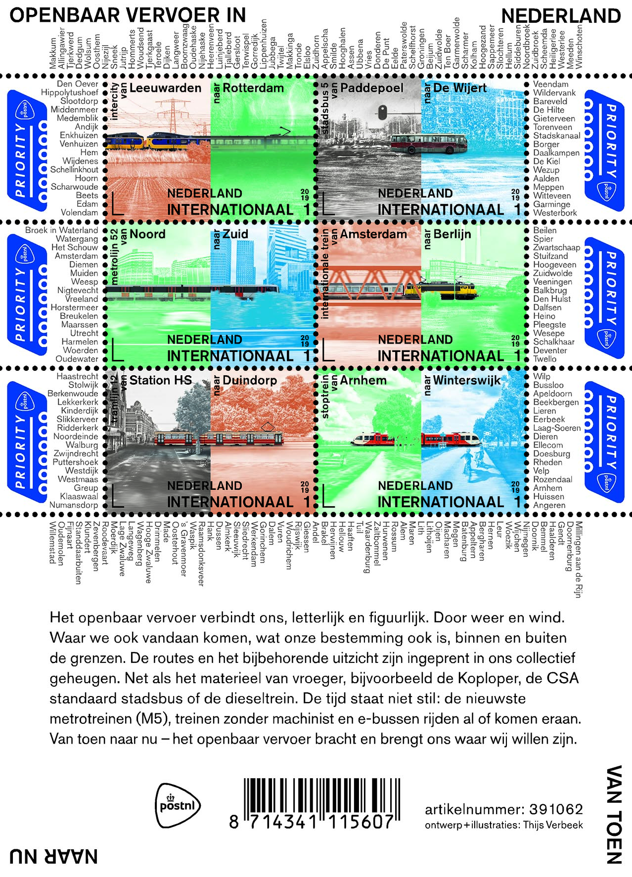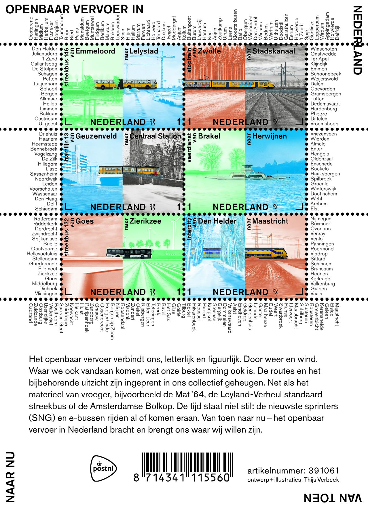 PostNL geeft op 19 augustus 2019 twee postzegelvellen uit, beide met de naam Openbaar vervoer in Nederland, van toen naar nu. Op de postzegels van het eerste vel staat de waardeaanduiding 1 voor post tot en met 20 gram met een bestemming binnen Nederland. Op de postzegels van het tweede vel staat de waardeaanduiding internationaal 1 voor post tot en met 20 gram met een internationale bestemming, met het Priority-logo op de tabs.